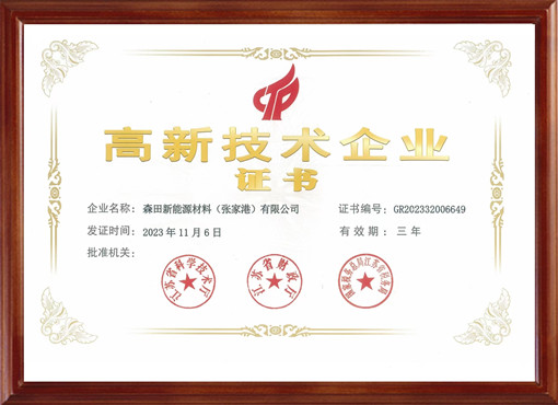 自2011年8月起,森田新能源材料(張家港)有限公司成功獲得“高新技術企業(yè)”認證。