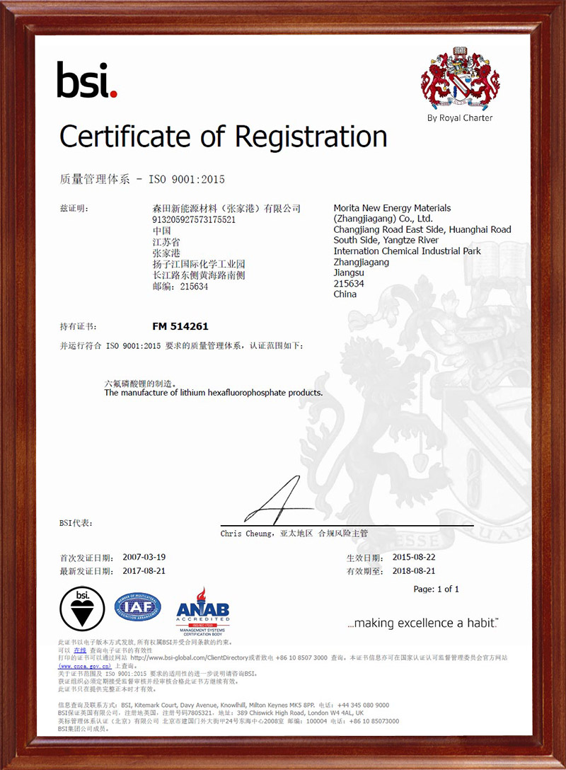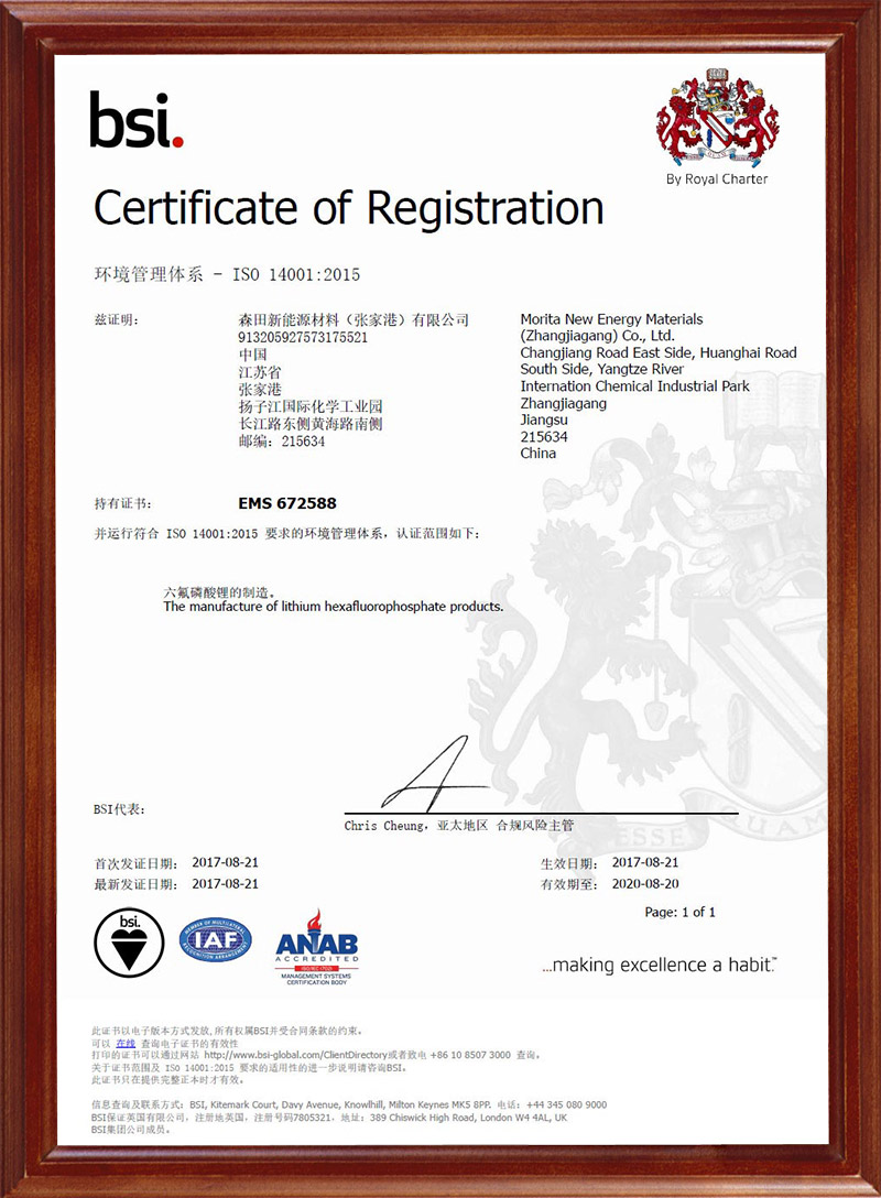2007年3月,森田新能源材料(張家港)有限公司通過ISO9001和ISO 14001認證,嚴格按照IS0標準要求對質(zhì)量和環(huán)境進行管控,確保產(chǎn)品質(zhì)量,更大程度地滿足客戶要求。